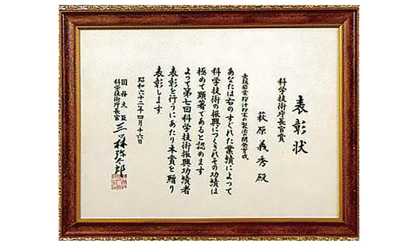 「活性保存製法(麦類緑葉粉末の製法)」開発育成により科学技術の振興に尽くしたとして、萩原義秀医学博士が科学技術庁長官賞を受賞