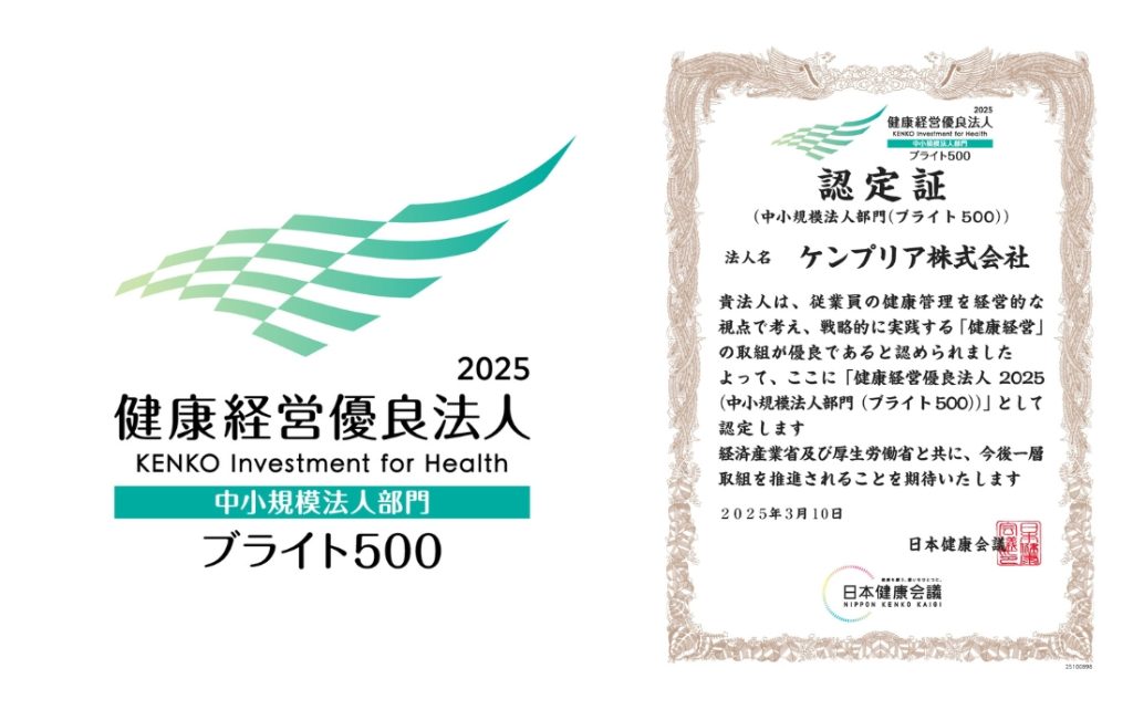 2025/03/12ニュース 健康経営優良法人2025(中小規模法人部門(ブライト500))に3年連続認定 ケンプリア株式会社は、2019年度から7年連続で、経済産業省が普及推進する「健康経営優良法人2025(中小規模法人部門)」に認定され、また2021年度から新設された、認定法人(2025年度は中小規模法人部門19,796法…