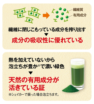 【製法】大麦若葉を生のまま搾り出し、熱を加えず粉末化