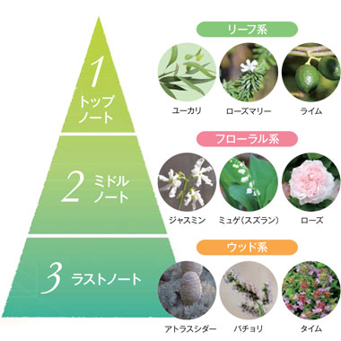 浴槽に入れた瞬間、ふわっと広がる爽やかな“リーフ”の香りから、入浴中に湯気とともにしっとり漂う“フローラル”の香り。そして、お風呂あがりもほんのり香る“ウッド”の香りへと、時間とともに移り変わる香りをお楽しみください。